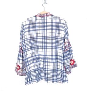 JOHNNY WAS Freddie Plaid Embroidered Flannel Button Down Shirt. Side slits design. Loose fit. Flare sleeves. Button front with velvet lining. Buttons and snap-on closure.