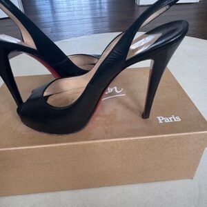 Elegant Christian Louboutin black slingback heels. Comes with original box and extra heel things. See pictures for wear. There is slight lifting on side of right shoe