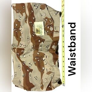 Camouflage military style mini skirt. Elastic waistband, front and back pockets, toggled sides, zippered and button up front.