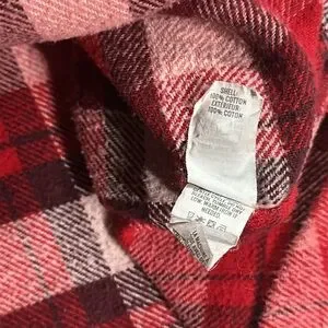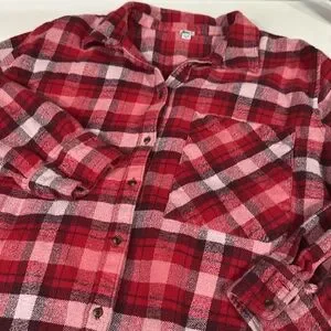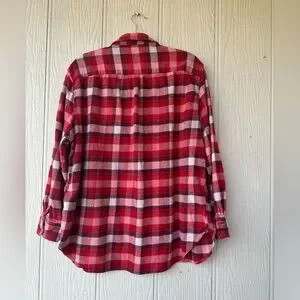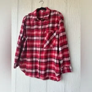 Oversized red plaid button-up shirt with a classic design. Features a front pocket and long sleeves with buttons at