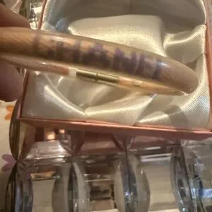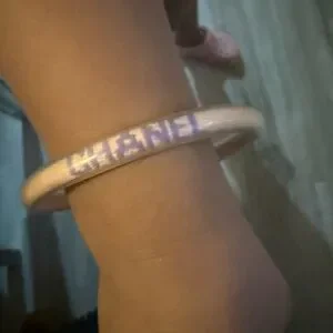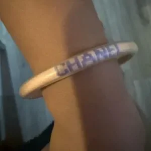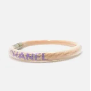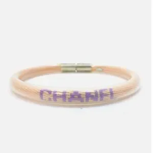 This exquisite CHANEL bracelet features a cream base with striking purple accents, elegantly spelling out the brand's name. The bracelet is designed with a circular shape and a metallic cylindrical clasp for secure wear. Its simple yet vibrant design makes it a standout accessory for any occasion.
