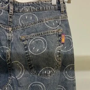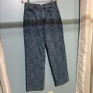 Stylish blue jeans featuring a playful smiley face pattern. Perfect for casual outings!