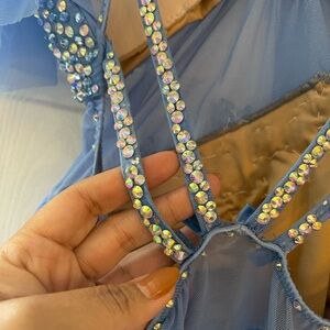 Custom gemmed blue lyrical costume, gently used, removable bra cups sewn in, Ladies 8-10