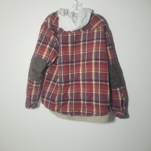 Cozy,Stylish plaid jacket with a cozy hood. Features a red, dark yellow, and black checkered pattern.Button front. Reinforced elbows.
