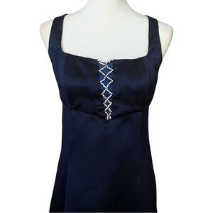 Beautiful navy blue satin sheath empire waist prom dress with a lace up back and silver rhinestone embellished bodice by Scene from the 90s or early 00s.