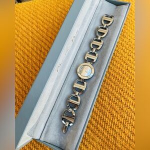 Elegant Christian Dior watch with a silver finish. Features a unique link design. This is very dressy, distinctive-rare to find-model with mirrored dial what reflects your outfit color, changes look at different angles and under different lighting.
