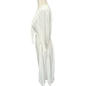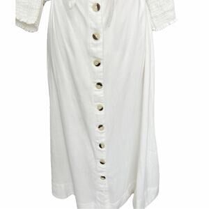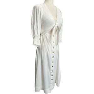 Very good preowned condition Free People String of Hearts dress is a viscous linen blend, which makes it drape nicely. Slightly off-white. Bodice is completely smocked front and back and there is a tie in front that comes up high so that there is a peekaboo keyhole area below. Puffy three-quarter length sleeves end with 3 inches of smocking. Tortoiseshell buttons down the front of skirt. Open neckline. Lined skirt. Measurements are taken flat and are approximate.