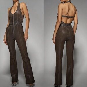 Brown Zipper front Halter Coated Denim Flare Hem Stretchy thick Jumpsuit