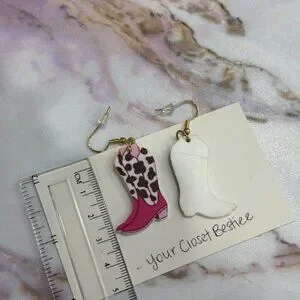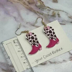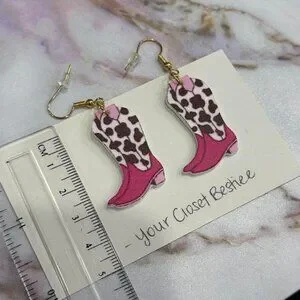 Pink and black cow print cowboy boot earrings - these are acrylic 2D earrings.