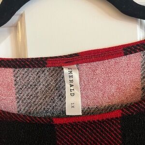 Chic red and black plaid dress by Emerald. Features long sleeves.