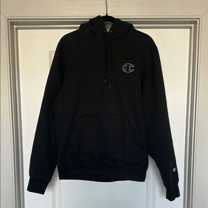 Classic black hoodie with drawstring hood. Features Champion logo on chest and sleeve. Very lightly worn and no defects