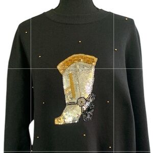 Stylish embellished black sweatshirt featuring a unique sequin western boot design. Perfect for adding a touch of western flair to your wardrobe.