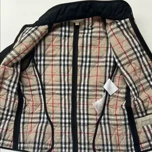 - classic black quilted design with Burberry plaid on the inside