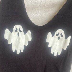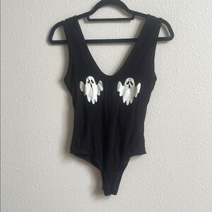 Stylish black bodysuit featuring playful ghost print. Perfect for a fun and unique look.