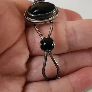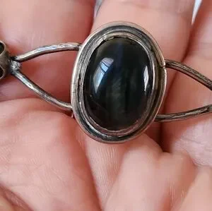 Vintage Native American Black/Blue Tigers Eye and Onyx Cuff Bracelet. My wrist measures 7" around, and the bracelet fits perfectly. Appears to be stamped APACHE, but stamp is etched in, so it is a little hard to discern the first letter.