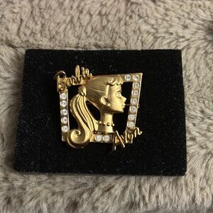 This is a vintage 1998 Barbie collectible pin. It was produced by Avon Products when they had Barbies in their collection. Pin is gold tone. Has 15 rhinestones around the outside frame. Has Barbie at the top, Avon at the bottom with a beautiful gold tone Barbie in the middle. Comes in original box, which is in like new condition. The foam covering on bottom of felt is degrading from age as pictured. It’s starting to come off in the box. B is bent up slightly as pictured.