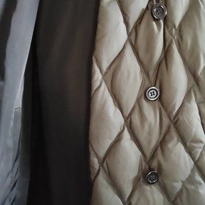 The quilted side is a very muted olive green, and the inside is black without quilting. Please see the photo of the tag for material, including down feather content.