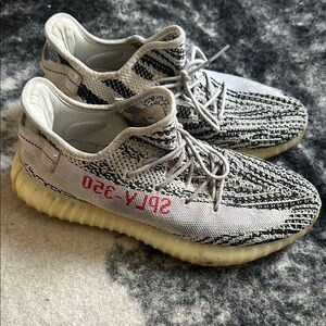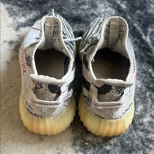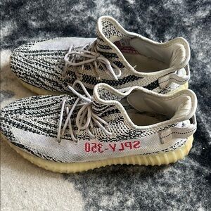 Stylish Adidas Yeezy Boost 350 V2 sneakers. Features a black and white pattern with red accents. Good condition.