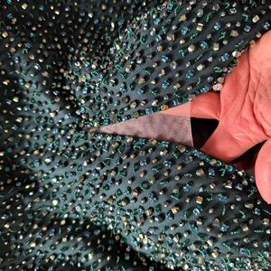 It is a beautiful, elegant, used dress. It does not have the brand tag. It is a size 6 and fits a size S woman. The dress looks good but has some defects that can be seen in the photos: a small tear in the back on the inside and some stones are loose. I also left photos of the inside to show how it looks.