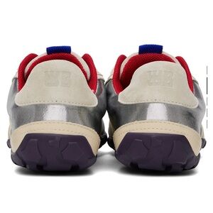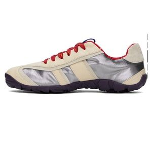 Wales Bonner silver paneled sneakers with red laces and purple Vibram sole / super comfortable - great cushioning / great condition with slight wear - worn just a few times. Fits true to size. Sold out - purchased full-price ($625) from Ssense in 2024. Comes with original box.