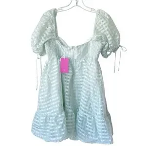 Capture a fresh, romantic look with this Amanda Uprichard mini dress. Designed with a dreamy babydoll silhouette, this dress features a soft mint green gingham print on a subtly textured fabric. The sweetheart neckline and voluminous puff sleeves with adjustable ties create a feminine, Coquette-inspired aesthetic. Its lightweight feel and tiered ruffle skirt make it a perfect choice for spring brunches, garden parties, or summer vacations.