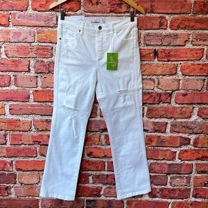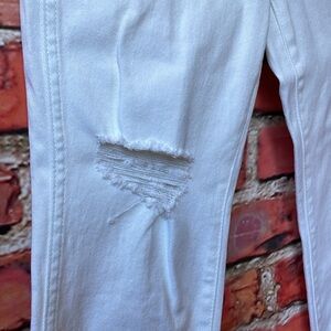 These jeans are brand new with tags! They are bright white distressed Sam Edelman Linnie kick flare jeans in a women's size 28. They are in the 5-pocket styling with a button-zip front closure. It is in the flared leg style, with distressing around the hip and over the knees in front. They have a bit of stretch to them for the perfect fit. There is a mark on the front and one on a back pocket that are photographed and important to note. These jeans are simple yet stylish, versatile, and perfect for spring!