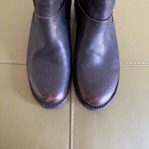 Frye Veronica Bootie in intentionally distressed black leather. I don't think these have ever been worn, but there is a scuff (see last pic) that does not look like intentional distressing. No original box (but will ship in a box).