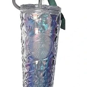 Iridescent cold cup ornament key chain by Starbucks. Features a shimmering design.