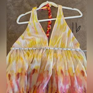 Stunning tie-dye maxi dress with a halter neckline. Features a blend of yellow, orange, and pink hues. Perfect for a beach day or summer outing.