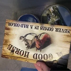 Decorative sign featuring horses and the phrase 'Good Horse'. Rustic brown tones.