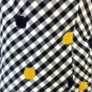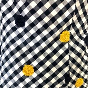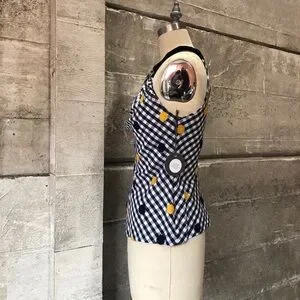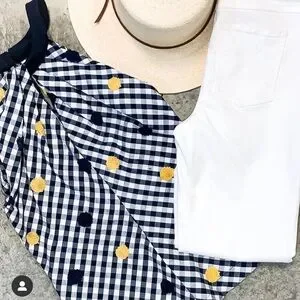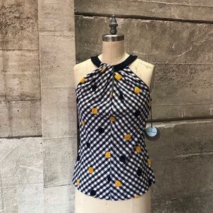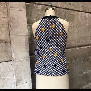 Navy and white gingham fitted sleeveless top with embroidered yellow dots. Fully lined. Perfect with a white jeans or denim shorts.