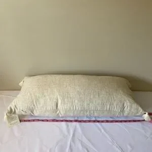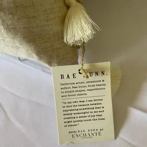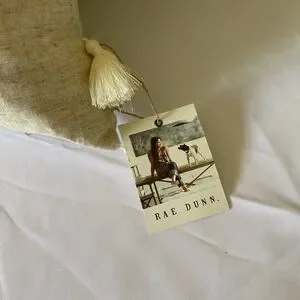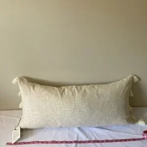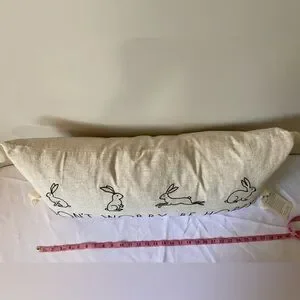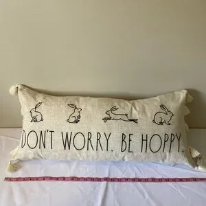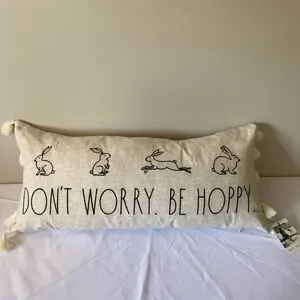 Decorative Rae Dunn pillow featuring playful bunny illustrations and the phrase 'Don't Worry. Be Hoppy.' Features tassels on each end. Perfect for adding charm to any room. Pillow case can be removed.