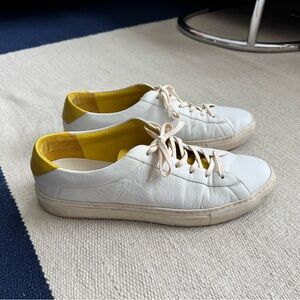 Brighten up your wardrobe and your mood with this lively version of our most-loved Capri. It's handcrafted in Italy with a yellow tongue and heel counter that really pop alongside the white leather, then set on an off-white rubber sole.