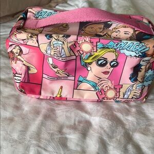 This Estee Lauder cosmetic bag showcases a playful cartoon-style print on a vibrant pink background, making it a standout accessory. Its boxy, rectangular shape is perfect for organizing makeup essentials, while the bright pink zipper ensures easy access. Ideal for travel or daily use, this bag combines functionality with a fun, eye-catching design.