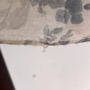 Lightweight summer/spring scarf. Blue floral pattern on cream fabric. Small area of pulling at hem as shown