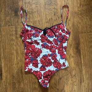 Vintage late 1990s Moschino Mare black, white, red and blue floral logo print one piece swimsuit. Black trim. Adjustable keyhole tie closure at front bust. Plunging low cut back. Light padding at bust. Nylon and elastane stretch fabric. Very good vintage condition. There is some very minor yellowing at some of the white trim, not noticeable when wearing though. Listed a US 34/M, but runs a little small as it’s vintage- best fits a 6/8 in my opinion but please refer to measurements. Pit to pit flat across 16” waist flat across approx 12” but fabric stretches plenty to fit when worn.