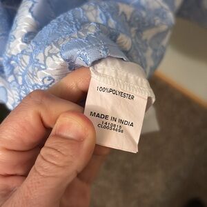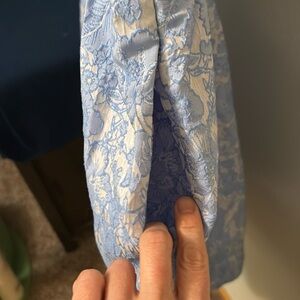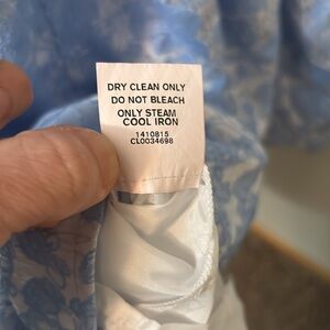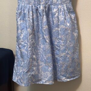 Sweetheart neckline, silver white and blue tactile raised flower print, lined. Cap sleeves. Has pockets. Side zip. No stains or damage. NWOT. size 10. Bust 18 inches length 37.5 inches hip 25 inches waist 15 inches. Seamed waist. Non stretch material. From a smoke free pet friendly home.