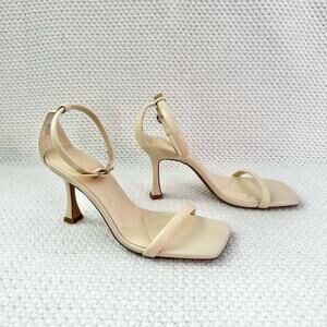 Size 38 from Zara. New without tags. Style No: 2302 910 002. Bone ivory squared toe single strap ankle strap stiletto sandals. Quilted bottom sole. Minimalist bloggers favorite style.