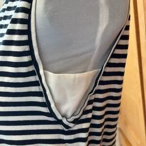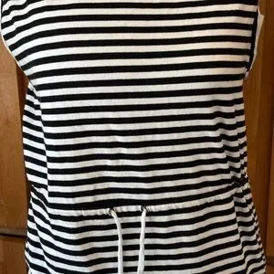 Stylish midi dress with black and white stripes. Sleeveless design. Drawstring waist for adjustable fit. Perfect for casual outings. Smoke & Pet free Household