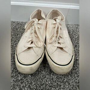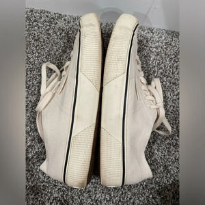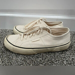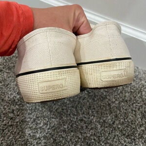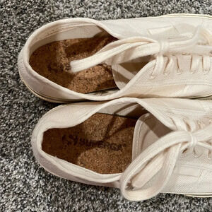 EUC Superga cream/off-white canvas sneakers, size 8.5 for men and 10 for women. Gender neutral / unisex. Some scuffing/dinge on the rubber soles. See photos for condition. Lace up. Cork insoles. A great casual shoe for spring! These are excellent quality and are made to last.