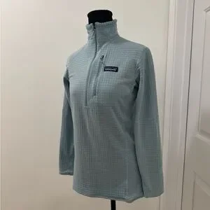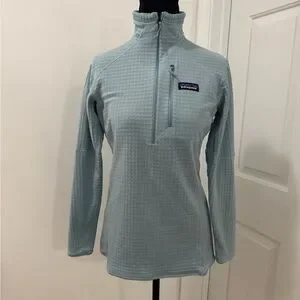 Patagonia light blue pullover with a quarter zip. Features a textured design and a chest pocket.