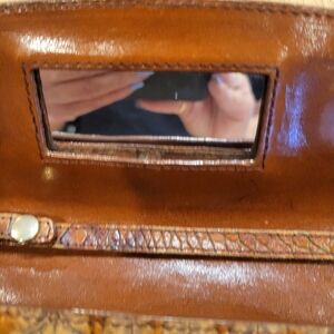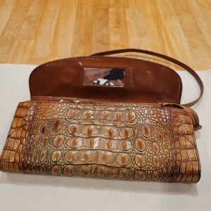 This BRAHMIN CLUTCH/SHOULDER BAG is in a luggage brown, Melbourne Croc leather. The bag features a solid with vintage accents. Rectangular in shape with a brown leather shoulder strap. The interior includes credit card slots, lipstick slot, mirror, coin compartment, bill compartment, cell phone space, & removable Shoulder Strap to use as a clutch. GOLD hardware & a designer theme, this lightweight bag is a stylish accessory from the BRAHMIN product line. Sophisticated crocodile pattern. EXTREMELY VERSATILE & in EXCELLENT CONDITION.