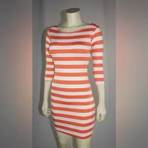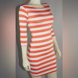Soprano Coral and White Striped Dress Stretch Comfy Casual Dress 3/4ths Sleeves