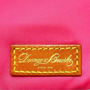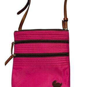 Dooney & Bourke crossbody bag in a vibrant pink color. Looks like it has never have been carried. Two large pockets on the outside. Clean with no structural issues, no rips, stains, tears or odors. 7.5 wide x 8 tall with adjustable leather strap. Smoke free.