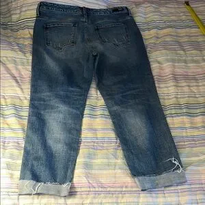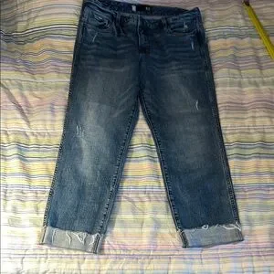 Stylish distressed finish blue denim jeans by Kut. Classic design with a back pocket. Raw folded up cuffs.