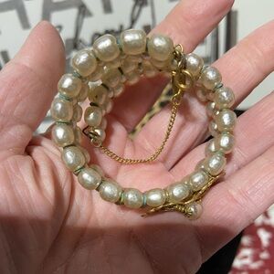 3 rows of faux pearls. The bracelet has a safety chain. The center filigree piece features a faux Pearl.