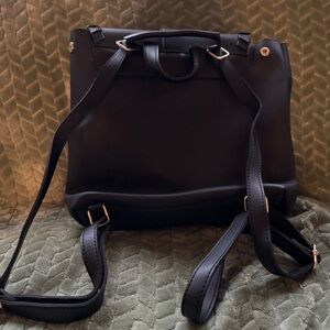 Sleek and stylish black leather backpack, perfect for any occasion. Features a modern design with a convenient front pocket.