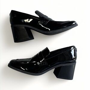 MARC FISHER Black Patent Leather Chunky Heel Loafer