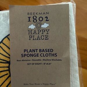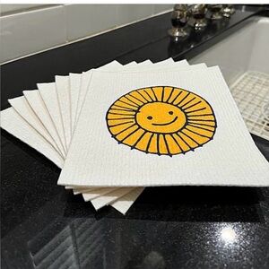 Set of eight plant-based sponge cloths with a cheerful sun design. Non-abrasive and machine washable.