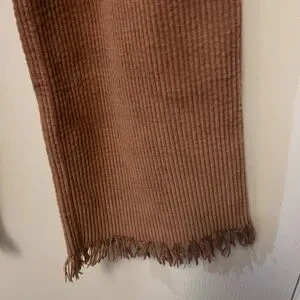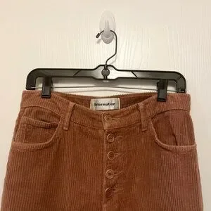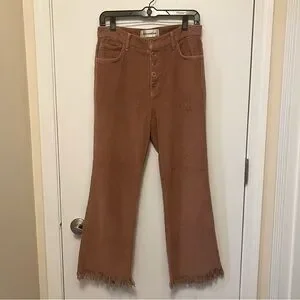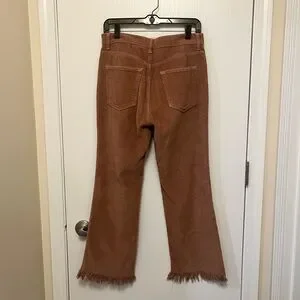 These rare!! Very soft brown Cordoruy pants have front & back pockets, a button up front closure, & fringed bottom hemlines. The tag states the material is surplus fabric content unknown. The waist measures 28 inches around, the rise is 10.5 inches long. . The inseam is 27 1/4 inches long. No stains. . No flaws!!